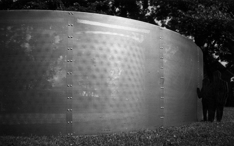 Six million (w)holes speak individually and collectively.A simple circular void, a single loss of substance,multiplies to becomea myriad of mandela patterns, a glittering transparent screen,a solid urban wall.Six million (w)holes gently weave between the trees,and through the box hedges and cross walks to form a wallfour hundred and sixty three feet long,and nine feet highAt night the figural pattern reverses:six million holes become six million soulsSix million (w)holes collectively create a serpent in a garden.Silent and alive.
