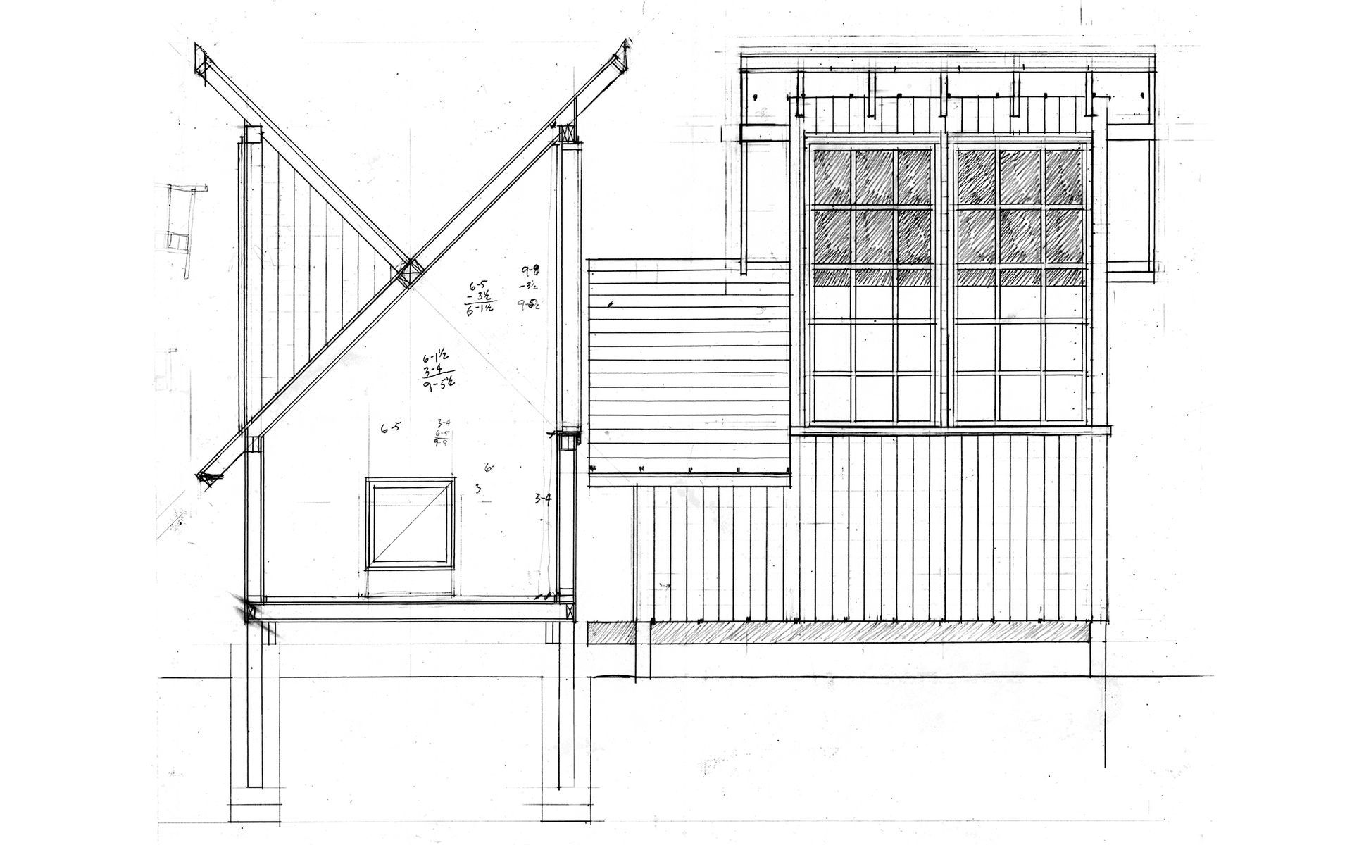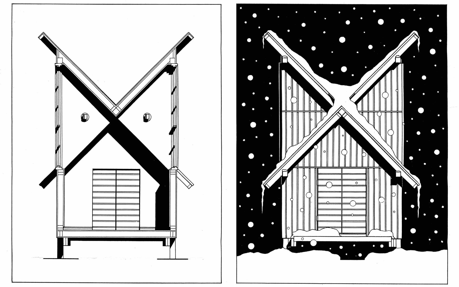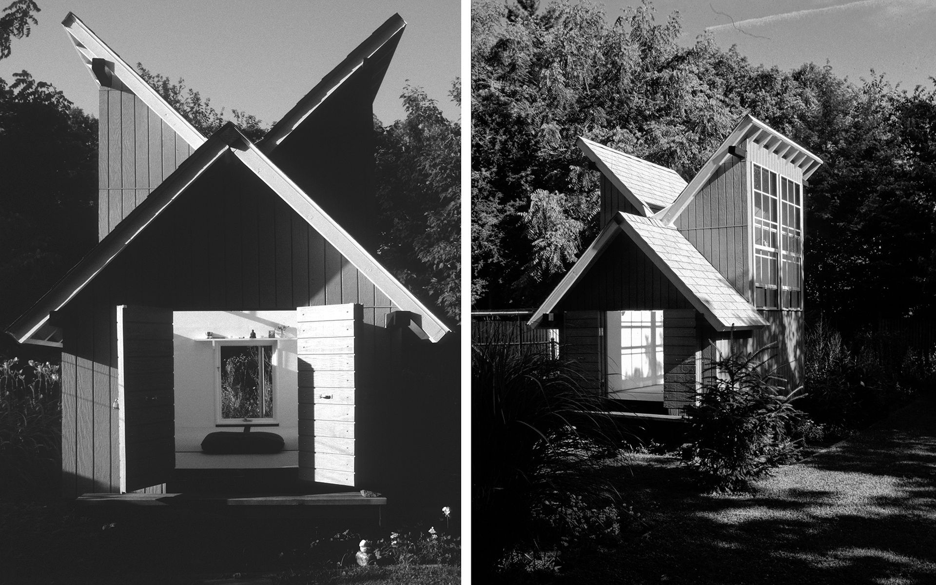 Through material selection, formal analogy, detailing and arrangement, architecture, landscape, and meaning are woven into a single composition. The Hut is raised off the ground to allow the garden to flow underneath. Rainwater collected from the v-shaped roof fills the ground pool underneath the small casement window to nourish the plant life. Collected water reflects sunlight into the room. A fountain provides meditative forground sound to mask the noise from a nearby road.