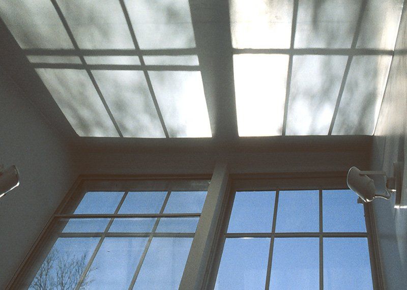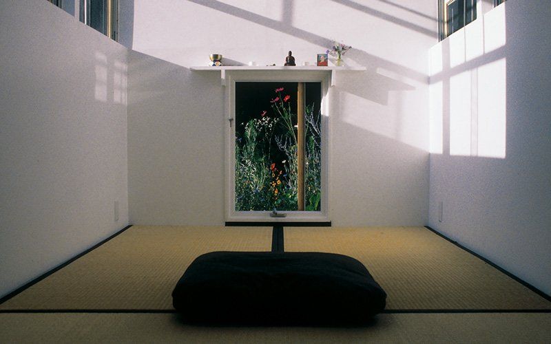 The size and proportion of a traditional tatami mat provides the human-scaled module for the floor plane, the fenestration, and the roof. The large windows are oriented east and west to create a continuous play of sunlight across the v-shaped ceiling throughout the day.