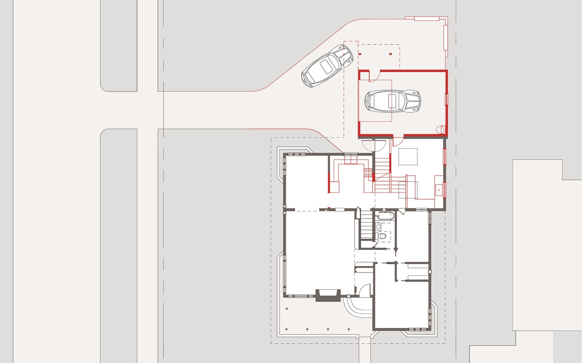 The new addition was designed to create a unique library/study for a university scholar. It expands upon the original house imagery and craft sensibility. The addition's overall form is generated from the diagonal stairway space that connects it to the main floor landing. The diagonal space ends with a skylight looking into the branching of neighborhood trees.