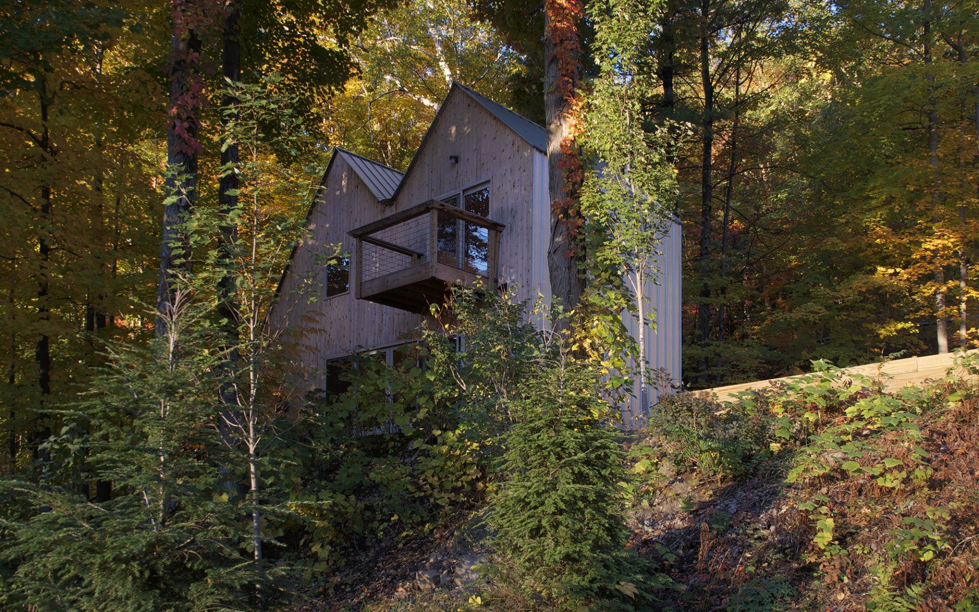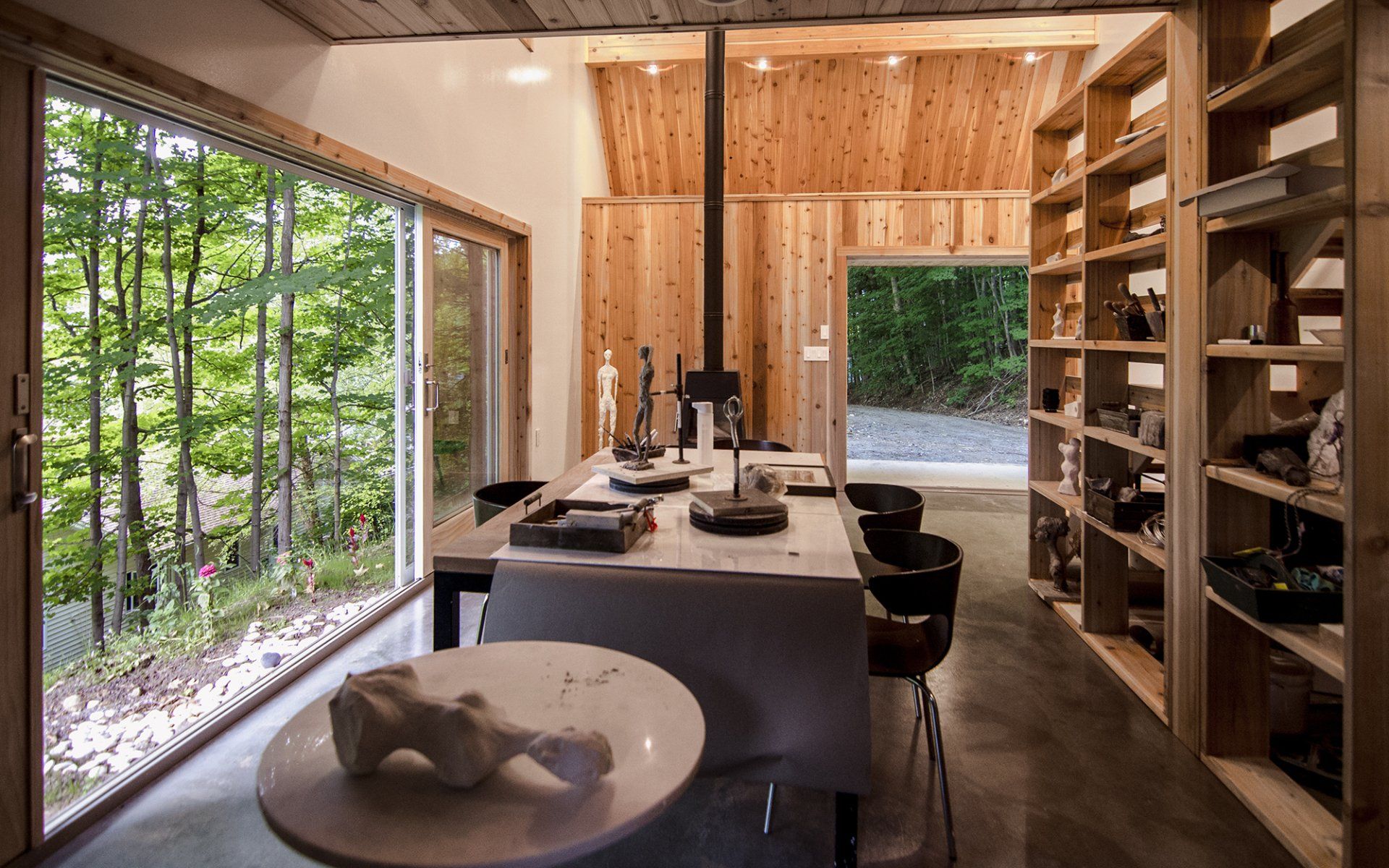 The owners of a steep lakefront property wanted a small studio for making sculpture and accommodating guests. The form reflects these two functions.