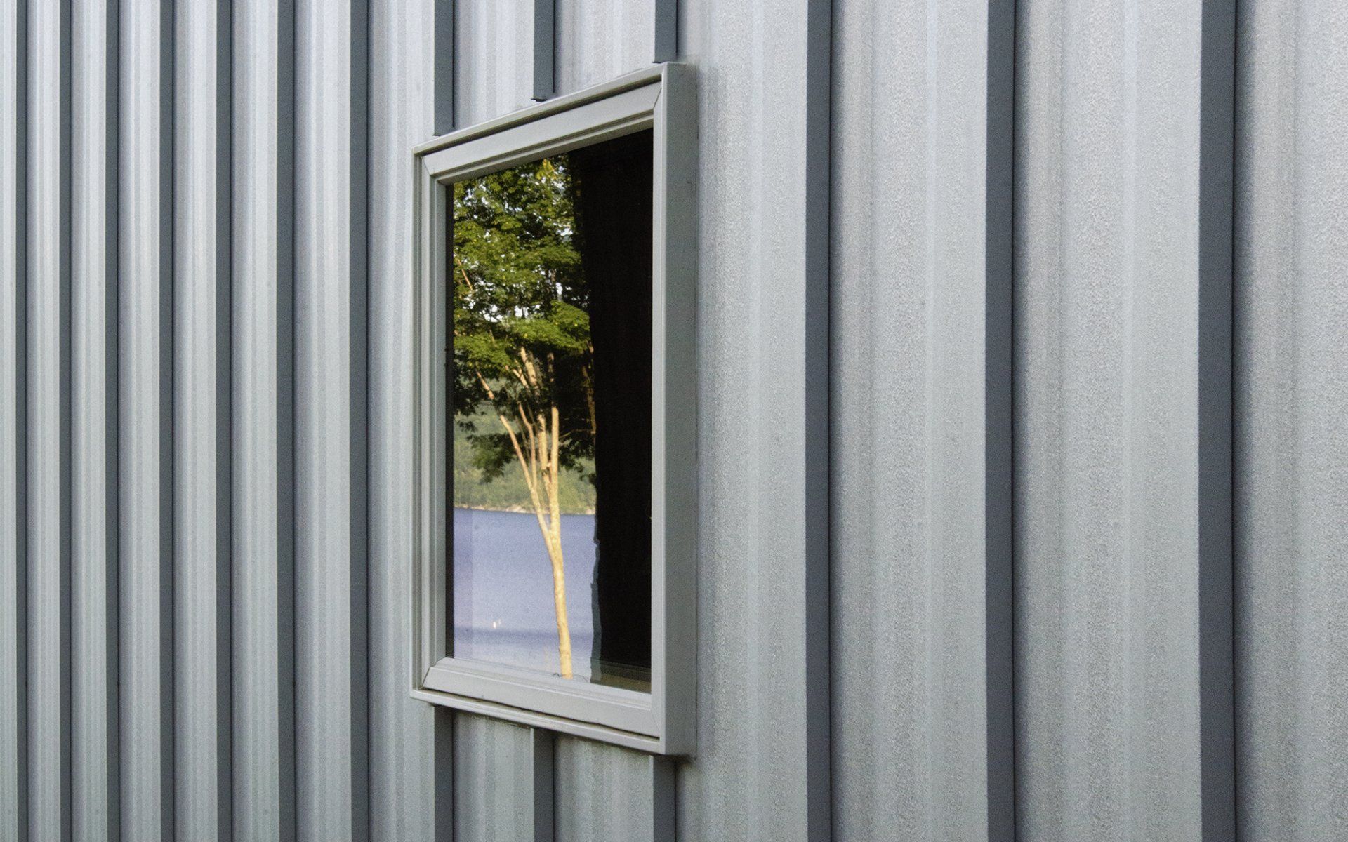 The exterior cladding references Adirondack rural vernacular and helps emphasize the spatial conception. Galvanized steel siding wraps the gables and north end. Vertical planks of local red cedar cover the polygonal east and west sides. The cedar is reintroduced on the interior to create a warm and aromatic environment.