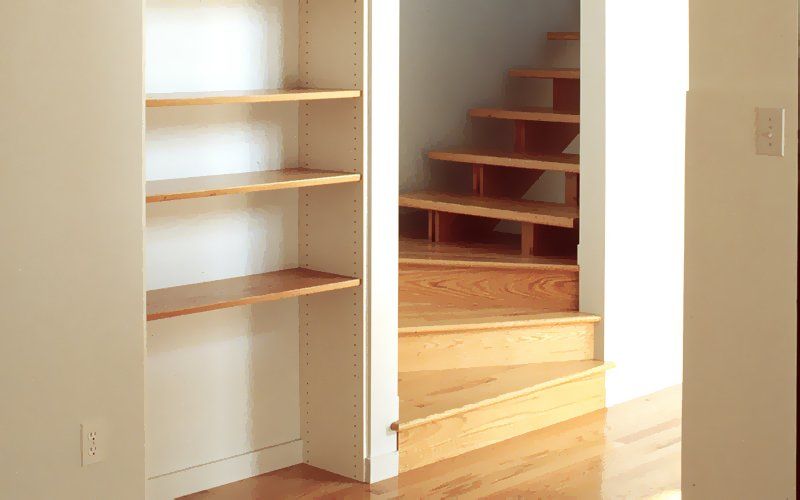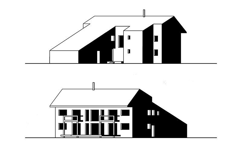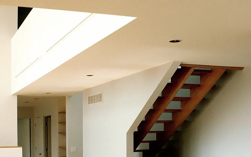 This economical 3300 SF residence is shaped and sited to deflect northerly winter winds and open to the expansive view to the south. This side features a deep overhang to shade the interior in the summer. but absorb south light in the winter. Rooms are located in an east-west linear sequence to allow cross ventilation throughout and to create a series of internal zones adaptable to guests or family use. The central feature is a 17-foot high living room overlooked by two offices for the faculty clients and a bridge on the second floor. Oak is used throughout the first floor public spaces and stairs, bouncing warm light on to the surrounding walls and ceilings. The walls are painted in semi-gloss white, light and medium gray, allowing the color mood of the interior to change with the atmospheric conditions outside.