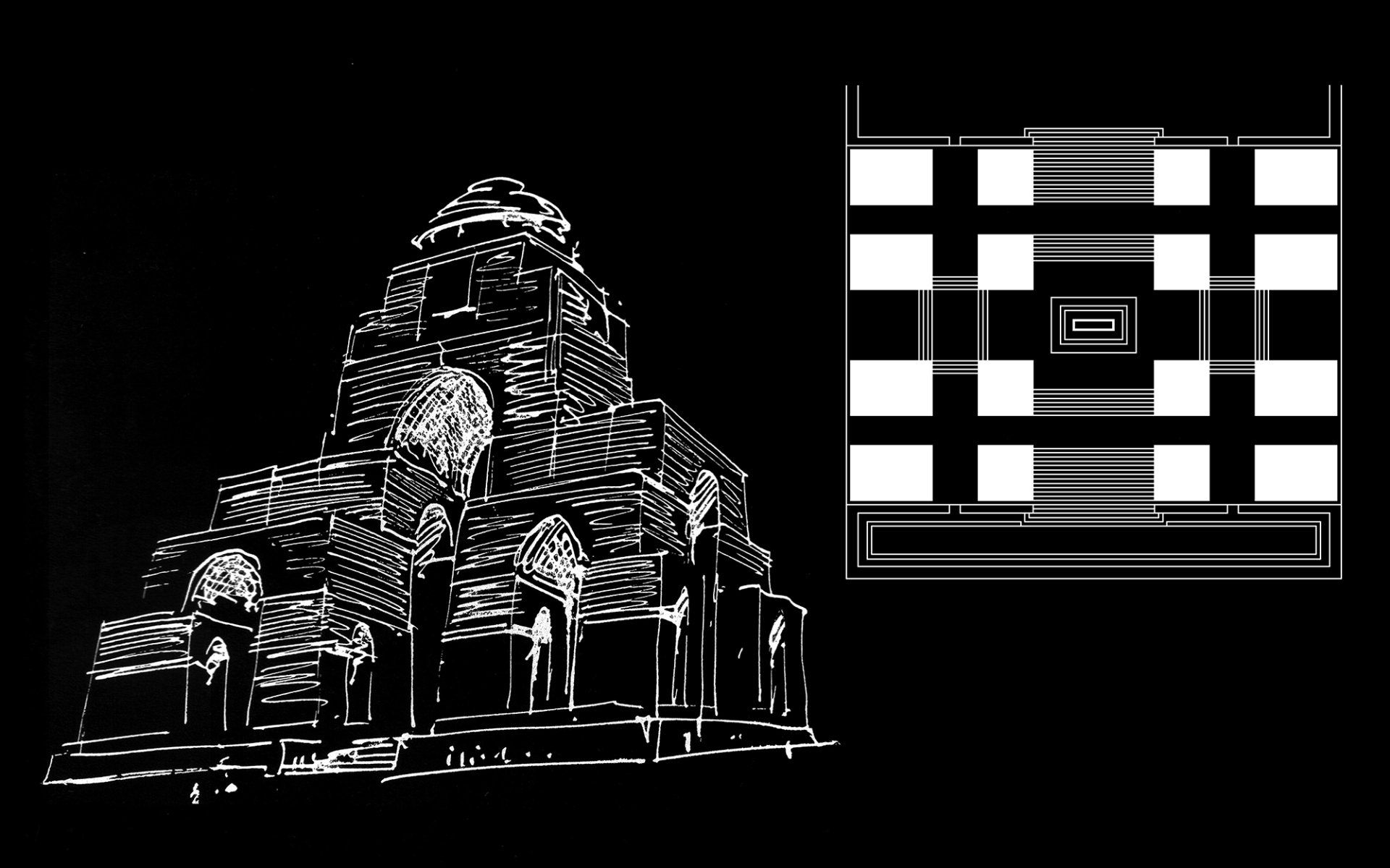Formally, traditional motifs create both a physical and transcendental passageway. The classical triumphal form of the memorial differs from its gate-like prototype in that it is stretched into a tunnel form. This expanded solution was undoubtably chosen allow the inscription of more names into the surfaces. Along the tunnel periodic occulii illuminate the vault and symbolize spiritual ascent.