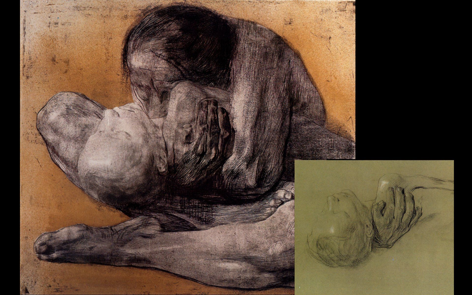 Kollwitz was informed of her son's death on October 30, and to a friend she admitted, “There is in our lives a wound which will never heal. Nor should it.” By December she had formed the idea of creating a sculptural memorial to her son, with his body outstretched, 'the father at the head, the mother at the feet,’ to commemorate 'the sacrifice of all the young volunteers.’ She was dissatisfied with the initial attempts, but continued to develop the project. Her diaries from those years indicate that the creative work on the memorial helped her through the process of bereavement. She describes being drawn to the possibility of establishing a connection through art “between the physically alive person and the essence of someone physically dead.”
